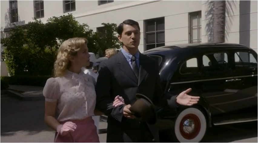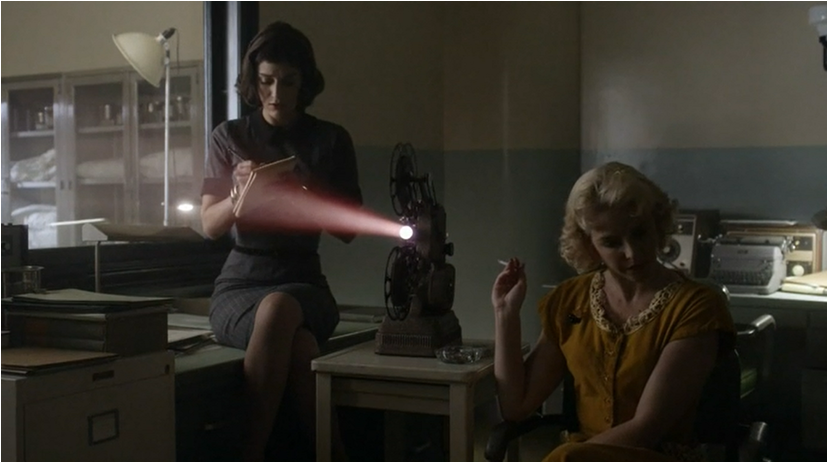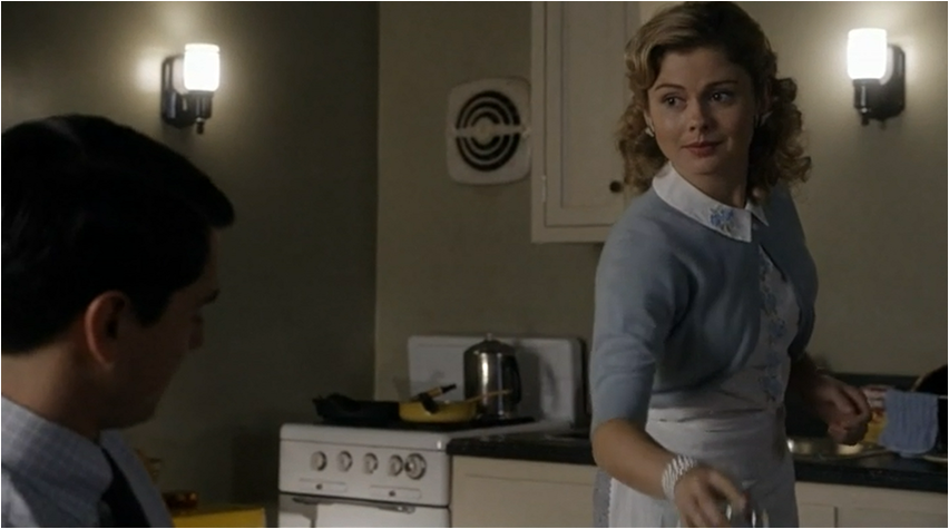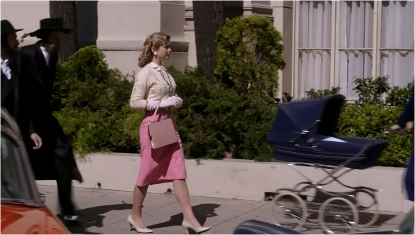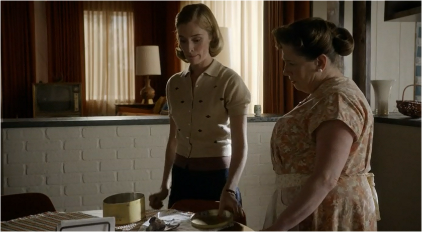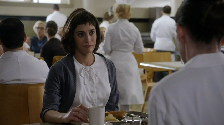 Instead Virginia makes her own excuses to save face and opts to lunch by herself. Up to this point Dr. DePaul has been hostile toward Virginia, but thanks to some good grades in her class it looks like Lillian is warming to her. Lillian talks cafeteria group dynamics and how she had no table to sit at – imagine your own 1950s Mean Girls/Clueless/10 Things I Hate About You like explanation of who all the cliques are. Lillian offers some words of wisdom that Virginia will recite later “The work is what endures.” Virginia’s white and grey ensemble is very much in tune with Lillian’s wardrobe color palette; Virginia’s tailoring is more modern and less severe in style and the bow mimics the other secretaries. In a way she is caught between several different roles and not fitting in with any of them.
