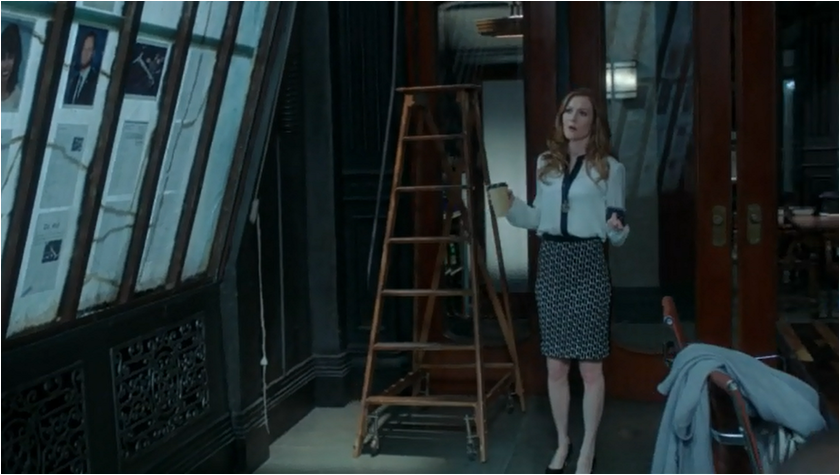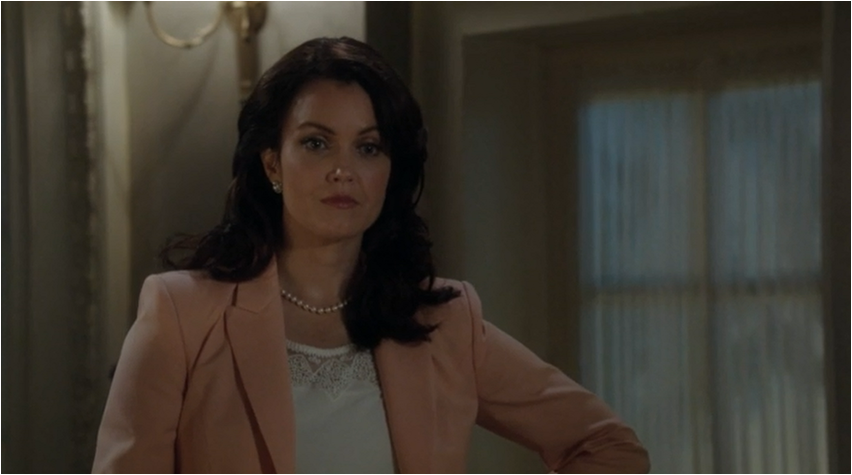 One of the external factors that is causing Bill stress this week is his mother and he still isn’t really on speaking terms with her. Bill thinks by revealing what he is actually researching at the moment it will get her out of his hair and it’s quite the opposite as Essie refuses to be shocked by this. Essie’s crime is not protecting Bill from his violent father and her general denial demeanor. Unlike anything else she tackles this problem with her son head on and this includes showing up with a hamper full of food at work. The “E” pin on her coat is very much like Jane’s “J” from earlier this season and the flashes of fur and matching red accessories show that Essie is a woman of means.