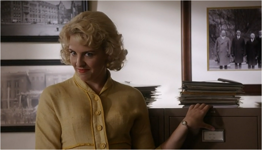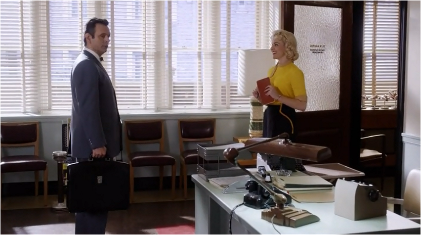 Another day, another yellow outfit for Jane and she’s pretty comfortable in the environment of Bill’s office. This could be thanks to Virginia’s helpful tips including no stray paperclips ever and no mayo on Bill’s sandwiches (like Bill I’d also prefer it if there was a law against mayonnaise). Jane is responding to Austin in this moment and Austin wants back on the study and he no longer only wants Jane as a partner.
