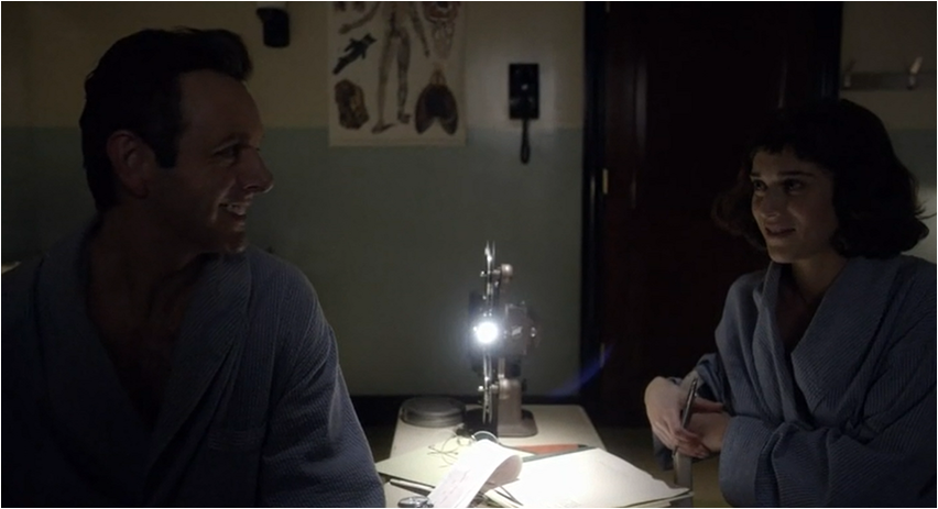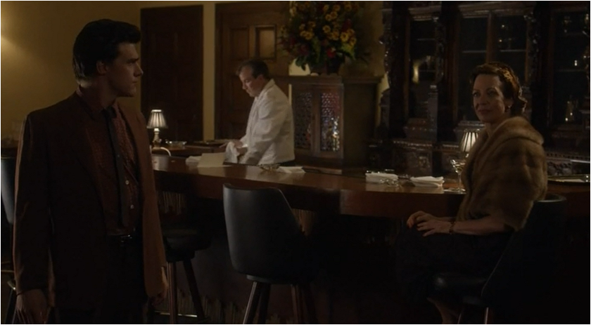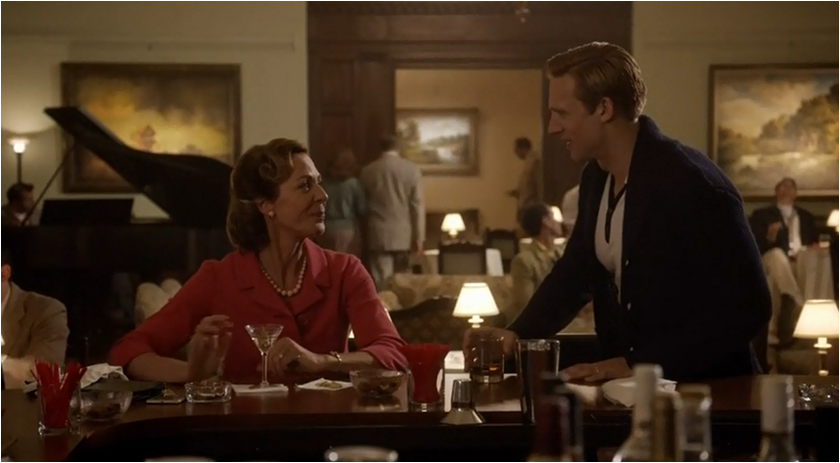 This disconnect between Margaret and Barton is made even more awkward with the presence of Dale and Margaret can tell straight away that Dale is not a grad student – is it his clothes? How he talks? One thing Margaret hasn’t perceived yet as far as I can tell is that Barton is gay; all the clues are there including his insistence last week that he hasn’t slept with another woman, his disinterest in Margaret’s body when she is standing in front of him naked and this meeting with Dale. Instead she buys his story that Dale is his pimp for lady prostitutes. Barton doesn’t want his marriage to be over and he wants a solution to what he calls “this terrible habit” and he seeks out Masters’ help. It’s pretty painful to watch someone contemplating aversion therapy like this – and sadly Masters and Johnson did at one stage claim that homosexuality was curable – and it shows the desperation to avoid admitting to being a gay man in the late 1950s.