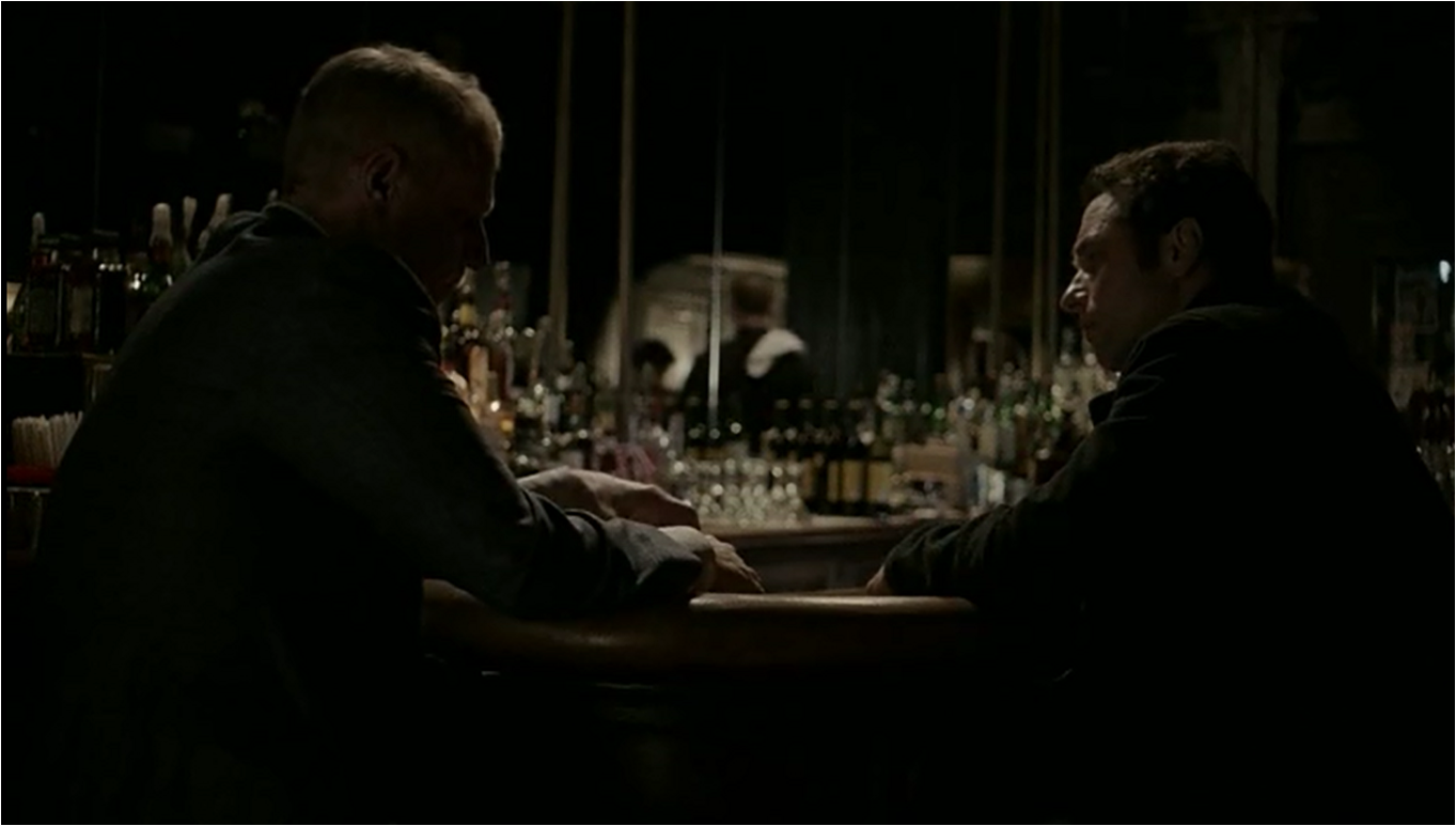 Affairs are a theme of this week from the sanctioned ones that Elizabeth and Philip are committing, to the more regular kind like Anton and Stan. Stan confides in Philip about Nina, well he leaves out the whole Russian element, simply saying that she is someone from work who is also married. Stan refers to their relationship as doomed and also lays out how home life with Sandra is pretty much an empty shell as they lead separate lives. It’s really depressing and it is shot in an appropriately dark manner with only the alcohol behind them bathed in light.