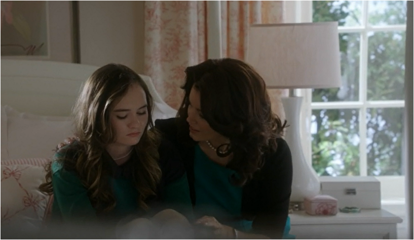 In terms of costuming and color there is a mirroring between Karen and Mellie, however the different shades of green (Mellie in teal, Karen in emerald) show they are not quite on the same page. For the interview Karen wears the blue dress Mellie described as crafting a sweet and wholesome image. Mellie is also in blue, but hers is on the purple end of the scale with a bold print showing where the power lies. The children have relented and the Grant’s are presenting a united front; baby Teddy gets to be involved even if he is just a super cute prop.