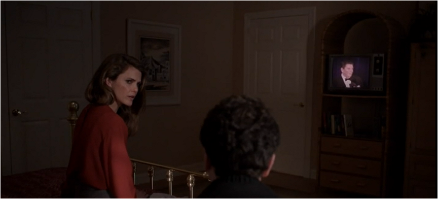 “Look at him, he’ll do anything. He doesn’t care.” As a Ronald Reagan speech about defense budget and basically being better than the Russians plays in the background, Elizabeth can’t help but utter her dismay upon hearing the news of the submarine deaths. The tuxedo Reagan is wearing only adds to this notion of them vs. us and while Elizabeth’s statement could apply to them – after all they also serve a country and do terrible things for their cause – Reagan’s speech punctuates their conversation as if he is taunting them.