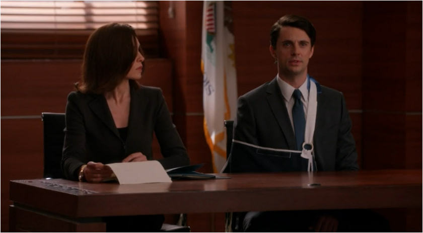 The Good Wife 5.18 Alicia and Finn light greyOne noticeable change between each hearing with Finn is what they are wearing and the mood that is represented in their color palettes. On both occasions they are in tune with each other; the first day their dark suits reflect the negative mood of the proceedings. Not so on the following day and they shift to lighter grey tones and when Alicia arrives it is clear that a weight has been lifted. Finn mentions Alicia’s brighter mood and Alicia responds that she “had a good night’s sleep.” Alicia beating down the smug assertions of a panel of guys who have used the same methods they are trying to punish Finn for is incredibly satisfying, as is getting this line past the standards and practices people “By going down on him?” Finn’s amused expression speaks volumes for us all. By highlighting the hypocrisy in this forceful, giving none of the fucks manner is just what Alicia needed to get out of her funk and it’s amazing to watch.
