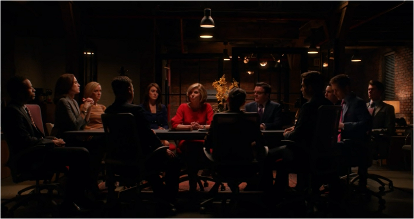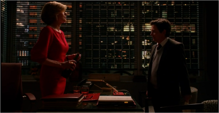 Not a merger, but Diane asks Florrick Agos to take her and her $38 million in billings and while this always seemed like a likely scenario it is still incredibly satisfying to see it play out. This meeting takes place in the no doors conference room and the tension between Cary and Alicia is palpable as they sit at either end of the table. Clarke continues to play mediator and this wide shot highlights all the major players in the scene. The flash of pink helps Cary stand out and Alicia’s light grey suit differentiates her from the others at the other end. Robin is the only character in casual wear, highlighting her presence and Diane is the focal point in both the red of her costuming and the message she is there to deliver.