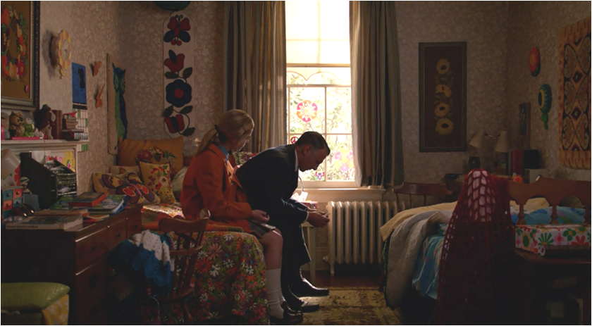 The camera stays on Betty with the men out of focus in the background; she is the object being discussed and while they do so without acknowledging her we cannot escape her face of concern. We linger with her as she registers the only real fear we see from her over the episode as she moves through the stages pretty quickly only briefly resting on denial and ending up with acceptance by the time we hear her sob inducing letter to Sally. I thought the Peggy/Stan chat was bad enough on tear stained cheek scale and yet this hits the upper echelon of crying; the heave sob.