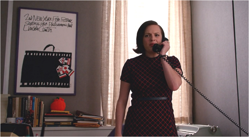 In this shot Peggy is looking at Harry Crane how we all look at Harry Crane while wearing an incredible green and orange outfit that I need in my life.