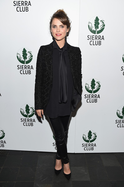 Keri Russell loves a leather pant and this all black ensemble that she wore to the Sierra Club’s “Act in Paris, A Night of Comedy and Climate Action” is very much her signature fuss free style. That doesn’t mean to say it’s a boring outfit and the variety of textures elevate the look. A slightly darker red lipstick is very welcome especially paired with this up do. For a bolder Keri Russell color palette take a gander at these Americans season 4 filming photos. Actual screaming at those boots.