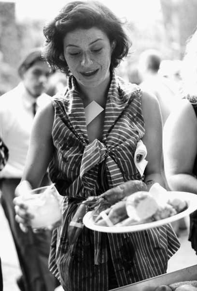 Also at the TCA Turner summer party, Alia Shawkat is pretty much rocking my whole party aesthetic; drink in one hand and plate of food in the other. Love her very cute striped knotted shirt for extra casual vibes.