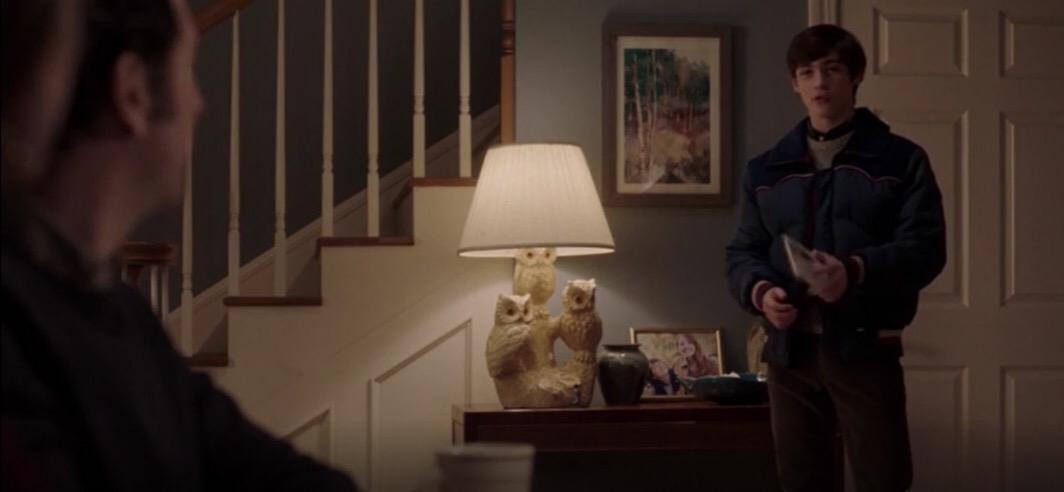 Family pictures act of reminders and the Jennings house is littered with these happy memories. Once again I am so pleased they use photos that are neither photoshopped or production stills. Also that owl lamp always catches my eye in how perfect and pretty ugly it is. And thanks to Twin Peaks all I can think is this lamp is not what it seems.