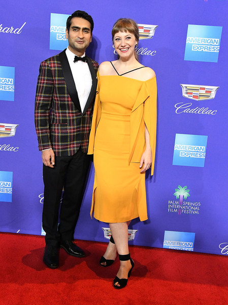 Kumail Nanjiani and Emily V. Gordon featured on our Best of 2017 “Out of the Box” rundown and they are already kicking the new year off in style. Mustard plus a cape element makes this a dream dress and I’m all for a plaid dinner jacket.