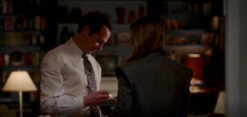Schlamme previously directed one of the most intimate Philip and Elizabeth scenes, thankfully this time there is no tooth pulling. Here the only thing getting removed (on camera) is Elizabeth’s earrings. The camera moves from a static shot to overhead as they lean into each other, then lying down on the bed. The calculator beeps causing Elizabeth to laugh, it is good moment.