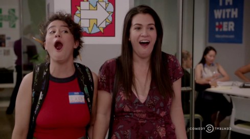 Here are a few delightful bestie moments from the new promo of which there are many. I am also coveting Ilana’s phone case (see also her hot dog one).