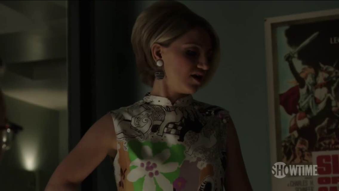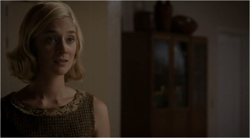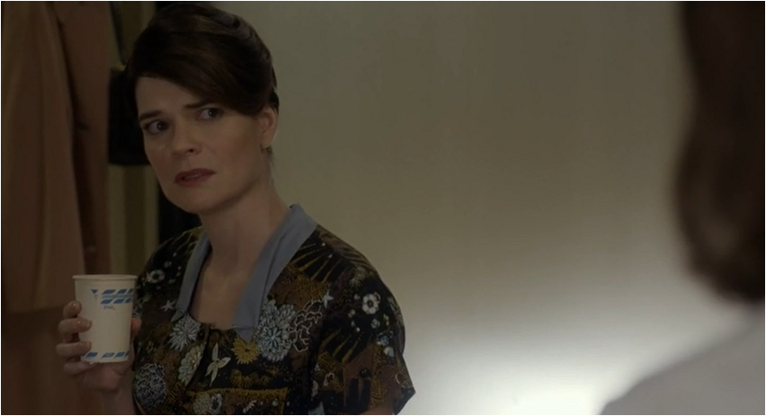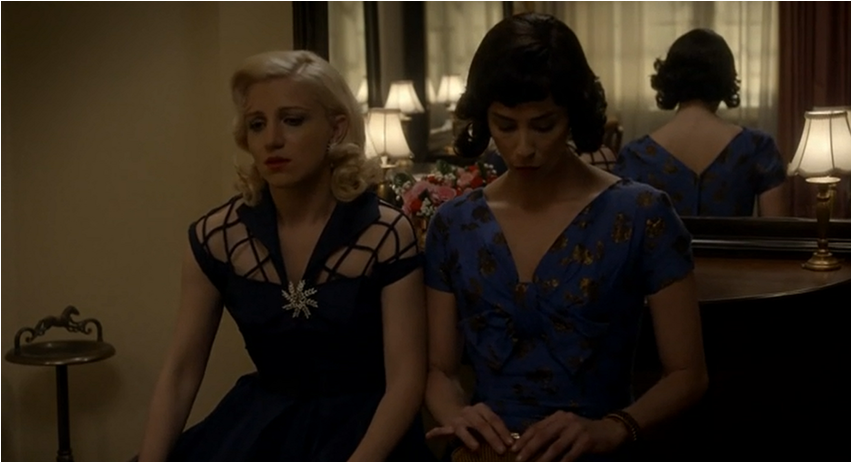 Masters of Sex 2.06 BettyAs I’m on the subject of Betty frocks here is another incredible one. There is nothing quiet or subdued about either Betty or Helen’s clothing choices. They clash at times in both color and pattern as they clash in their methods of continuing their relationship. Even their underwear is in stark contrast as Betty wears the white of innocence and Helen’s strapless basque is in super sexy black. Now that Betty is no longer getting ‘fertility’ treatments from Bill this story is now rather separate to the overall narrative and I wonder how they will converge again in the future. Sarah Silverman has been a terrific addition and I hope we get to see more of this relationship as we move forward.