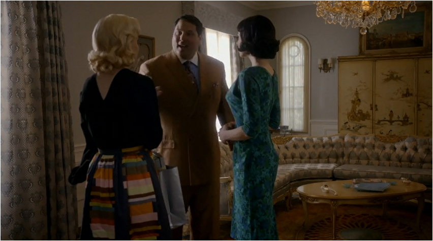 Masters of Sex 2.05 Gene, Helen, BettyI also really want to include this shot as there is so much going on in this scene costume and set wise; there is a clashing quality between Betty’s colorful stripped skirt, Helen’s floral teal dress and Gene’s camel suit. The opulence of the room (haunted by the ghost of a 93-year old) adds to the busy looking frame underpinning the conflict at play. There are ghosts in this room of course, but not the one Gene thinks there is.