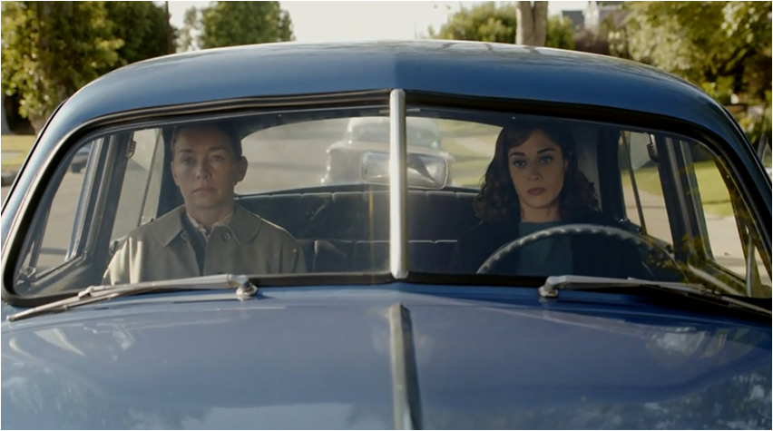 Masters of Sex 2.05 VirginiaThis whole episode is full of vibrant colors with strong blues dominating scenes; Coral is in blue when Libby attempts to give her advice and Libby is in a similar shade when she tells Coral she can take care of the master Masters bedroom. Betty wears electric blue when she confronts Helen and Helen in turn wears this to dinner. It’s like there is a power struggle between the women who wear this color. Virginia reverts back to red after her initial grey power dress and it’s the Capri blue car that gets referenced as a way to show the neighborhood isn’t so bad; this car is also the location for the Virginia/Lillian reconciliation. In the final scene Virginia is wearing a beautiful darker blue outfit when Bill pays her the ultimate compliment by referring to something she does way better than he does and I’m not sure if I’m reading too much into it, but this color plays an important part in the power struggles between some of these relationships. Now Bill and Virginia are in a better place she is wearing less black around him. The overall challenge is far from over and this is not a conflict free situation, however it does appear that Bill and Virginia are on the same page in the same hospital once again.