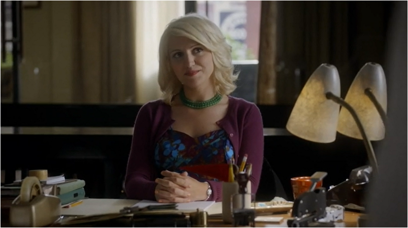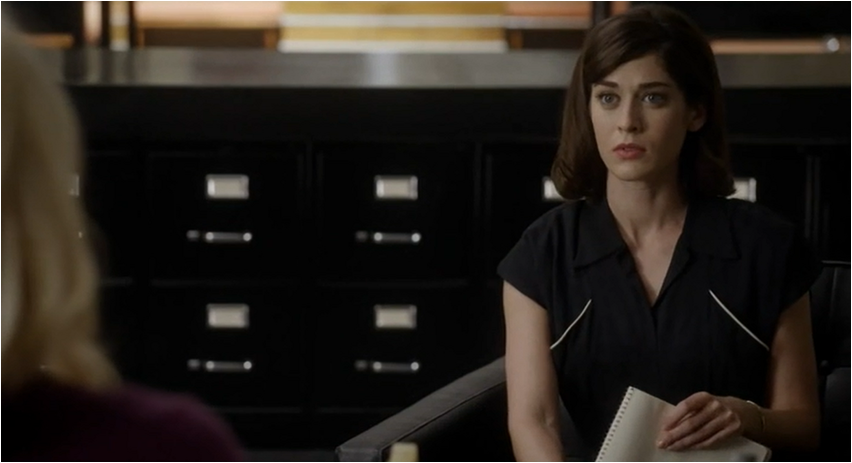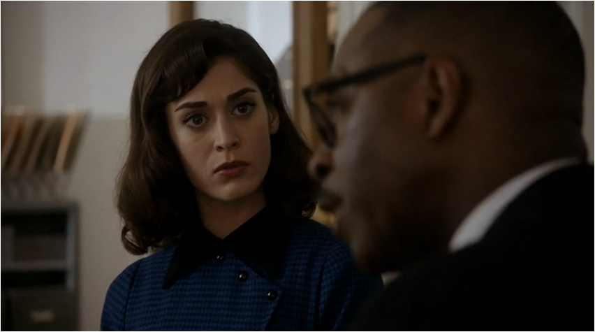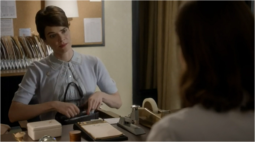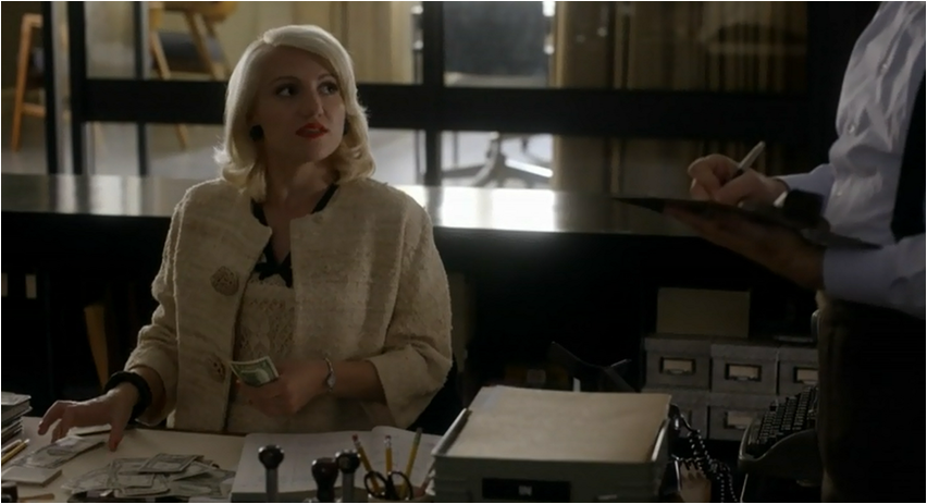 Masters of Sex 2.07 Betty creamBetty’s style continues to make a bold statement and while she has ditched the furs (because she probably can’t afford them), she still manages to stand out in this office. Over the course of the episode we see multiple costume changes from a range of characters; however Betty is the anchor as she is the visual cue and the one who acts as the title card denoting the passing of time. Annaleigh Ashford has been a terrific regular addition this season and I am so glad to have her back in the main storyline.