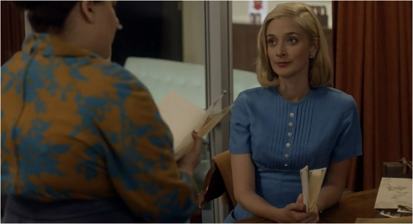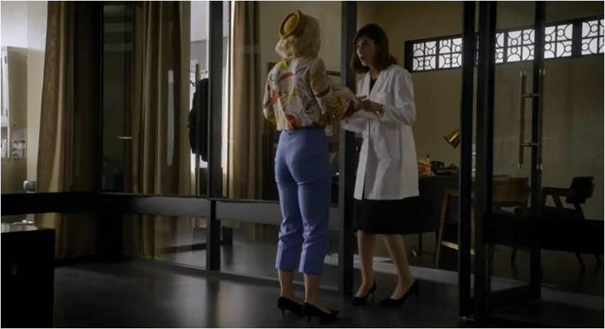 Masters of Sex 2.07 Betty blueIt’s Betty blue Capri pants and there is a slight shift in office style as we head into a new decade. This is of course a period still very much influenced by the previous decade and hats are still on point, but the overall look is changing and pants are suitable work attire. They are for Betty anyway and while we haven’t seen Virginia in pants at work, she is wearing them in her spare time as the final scene in the episode shows.