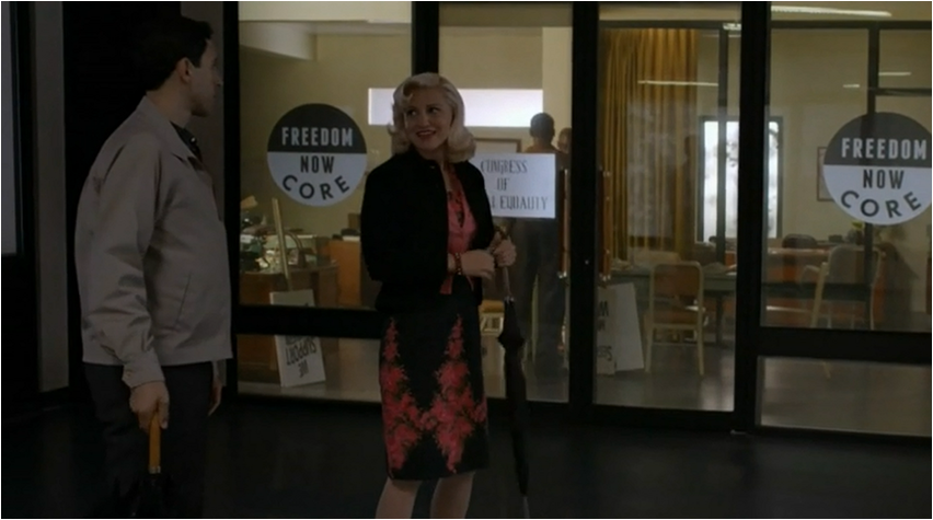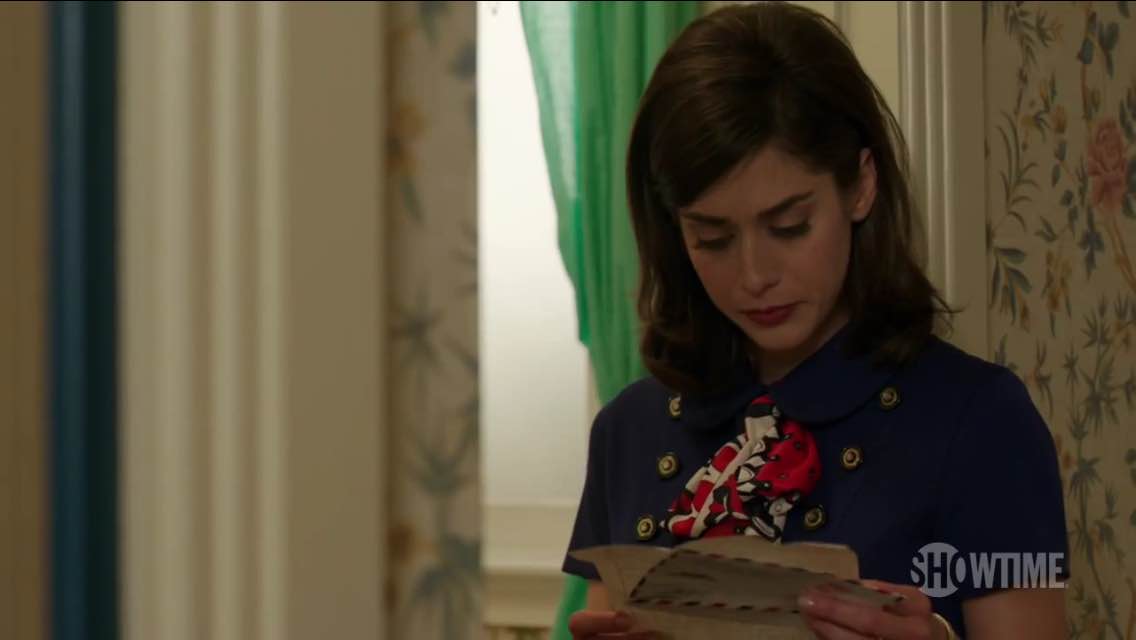 Masters of Sex 2.12 BettyAnd even though she didn’t have a crazy amount to do in the season finale, I wanted to include this shot of Betty in a beautiful pink cheongsam complete with a stunning butterfly pin as she gets all misty eyed at JFK’s speech. Betty did also pipe up about while she makes fun of Bill’s bow ties, the long one he wore on TV just isn’t him and he should insist on his regular attire. I hope that Betty gets to be more than just the comic relief in the office next season and gets something more substantial like she had at the start of this season.