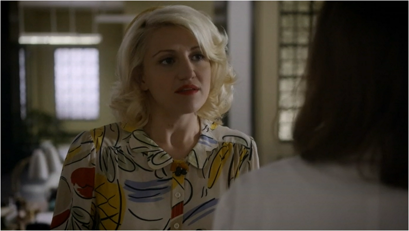 Masters of Sex 2.07 Betty patterened shirtWhile Virginia makes her position clear by wearing the white coat, Betty isn’t reduced to a simpering secretary and even though Virginia wasn’t thrilled by Betty’s initial arrival (Bill hadn’t consulted her so this is likely the reason for the animosity, although Betty did have some choice words for Virginia about her relationship with Bill at the start of season 1). This final outfit from Betty had me howling with delight, the shirt by itself deserves the spotlight.