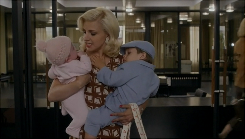 Masters of Sex 2.07Transitioning from one baby to two as Johnny gets a little sister in the first of several big leaps cutting out the fertility drama we have already witnessed. This is one year gone and now it’s 1959; Betty is a geometric pattern beauty in this brown and white frock. The kids are equally adorable in traditional pink and baby blue because of course Libby would dress them like this. That flat cap is to die for.