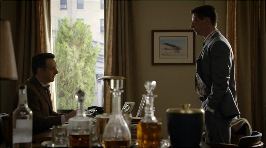 To believe that Frank is taking Bill’s story rather than Frank experiencing this brutish behavior himself is easier on Bill than to think of the alternative and we get to see some rare Bill tears as he acknowledges that he wouldn’t have left if he knew it would happen to his younger brother too. Not that Bill had a choice about leaving home; he didn’t do so of his own volition. Frank points out that they both escaped in their own way with one over the wall and one under while also saying that their father left Bill and Bill left Frank Jr. Bill can’t be blamed for leaving his brother initially although he really could have reached out to him since his father died and the tension between this pair isn’t going to be resolved easily; too much time has passed for it to be a simple hug it out resolution. It’s also worth noting that in the shot above, they are framed by the alcohol in Bill’s office and Frank hints on several occasions that he is concerned with his mothers drinking and Virginia points out in the hotel room that she is usually playing catch up with Bill on the drinking front. Also for all the similarities I am glad to see that Frank’s costuming is not a mirror of Bill’s and the bow tie is definitely still the Bill signature (I’m very into the polka dot number from this week that you can see below).