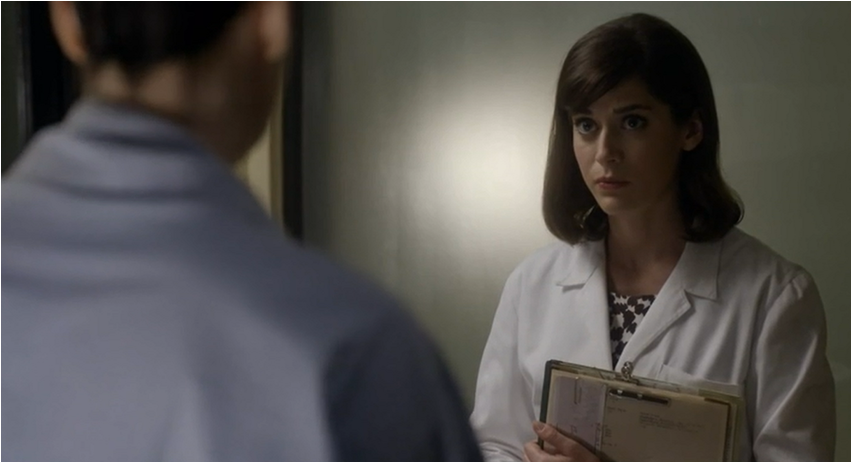 Masters of Sex 2.05 white coatThe return of the white coat! Virginia might not be an actual doctor, but the symbolism behind this garment is incredibly important. This indicates her experience, expertise and equal standing with Bill when it comes to their work on the study so while she doesn’t come with Dr. before her name she shouldn’t get overlooked. The dress Virginia is wearing is one of her super professional and very Lillian looking outfits thanks to the grey tone and high collar. We first saw this piece of costuming in the episode where Lillian was introduced and it also happens to be the first dress Virginia wore the lab coat with and this is significant. Inner strength is something Virginia possesses in droves and yet she has the same insecurities regarding her self-worth and how she is perceived as everyone else. The white coat is like armor and it sends out a message that Virginia is not here as a play thing for Bill. After her argument with Lillian it is understandable that she embraces this coat and dresses conservatively to portray a certain version of herself.