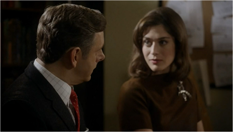 Shep Tally keeps talking about the importance of appearance and presentation on television with the infamous sweaty Nixon debate getting referenced; on radio Nixon appealed to more voters, on television Kennedy’s smile had just as much impact as the talking points. Virginia has a spark and natural stage presence, after all she was a performer before this became her career. Virginia looks the part from her sleek simple outfit with an incredible deer broach – Virginia’s accessory choices give me similar glee filled reactions as The Good Wife’s Diane Lockhart – and there’s nothing about her style or manner of speaking that needs correcting. When Libby points out they are wearing the same color this is of no importance as they are shooting in black and white. It also ends up being of no importance because they never get around to shooting Libby, or even wondering where she is and so it is not surprising that she views herself as being invisible.