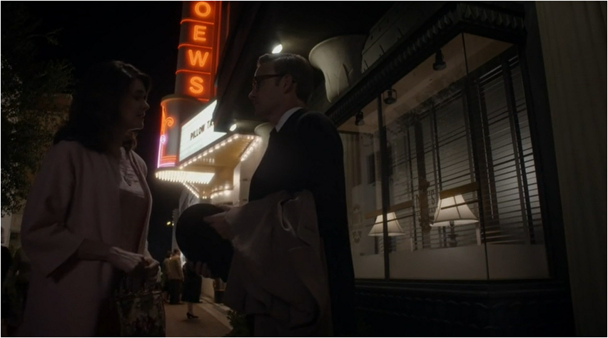 Masters of Sex 2.12 Barb and LesterHere’s a stunning shot (although rather dark) of Barb and Lester outside the movies talking about Pillow Talk. It might be because of all the Kennedy imagery throughout the episode and a similar hairstyle, but the pink ensemble Barb is wearing is giving me so many Jackie Kennedy feelings.