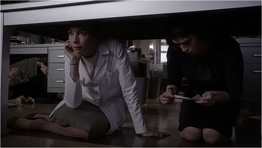 Masters of Sex 1.10 desk chatWhat this decision leads to is a pairing that has been growing over the past few weeks. In one of the simulated bomb warnings Dr. Lillian DePaul and Virginia share a desk shelter. As with the Virginia/Bill relationship, this one started out frosty and has been slowing thawing as Lillian comes to understand that Virginia isn’t the person she first perceived. Lillian is the one with the biggest ticking time bomb inside her; as with the threat of nuclear war she has her own condition that could kill her at any time. The research Lillian wants to do is incredibly important for the future of women’s health and the measly check of $600 is going to do nothing to advance her program. Virginia tends to be a glass half full kind of woman and she suggests charm as a way to obtain more funds and even though there are many similarities between Lillian and Bill, he has his gender to give him a boost when his terrible bedside manner fails.