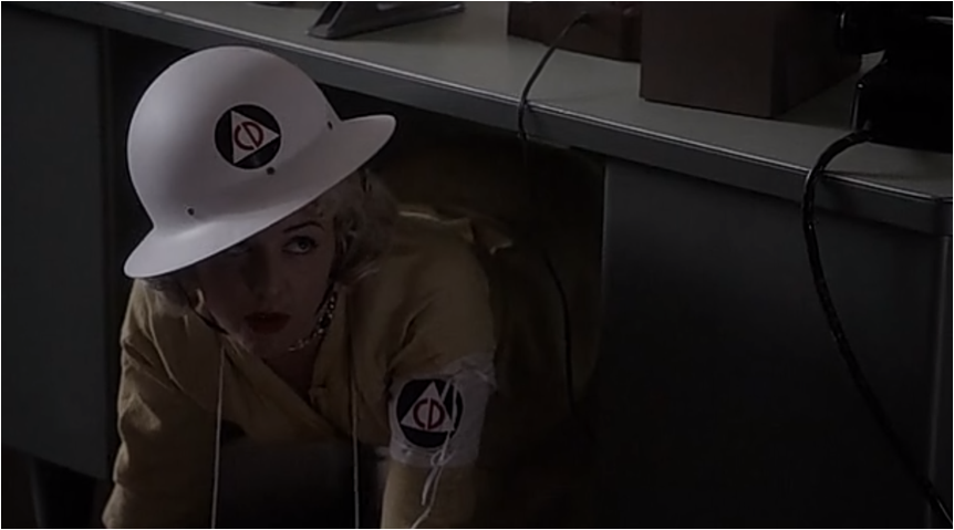 Masters of Sex 1.10 Jane as hall monitorBill isn’t taking this drill seriously as he has too much work to do and lots of other things on his mind, he yells at Jane for not being in the office, but as she is one of the hall monitors (hence the helmet at a jaunty angle) she has other things she’s meant to be organizing. Bill continues to get exasperated by the whole thing and he can’t believe how everyone is reacting.
