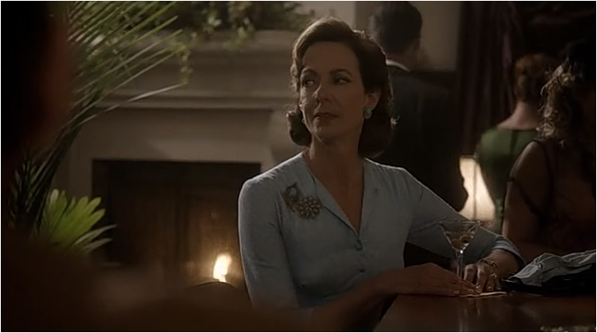 Masters of Sex 1.10 Margaret in a barSwitching it up later Margaret wears pastel blue with a double broach (Margaret’s broach collection is beginning to rival Diane Lockhart’s) for her trip to the bar to find out from a prostitute how she can please Barton in the bedroom. While Margaret hasn’t connected the dots about Barton’s sexuality the prostitute figures it out pretty quickly thanks to Margaret’s description of their sex positions, his disinterest in topless women in Tahiti and the young man who Margaret mistook for his pimp. Margaret laughs about this at first and seems briefly relived until devastation sets in. It goes without saying that once again Allison Janney is a revelation as she plays a wide variety of emotions. Margaret’s costuming alternates between red and blue within this episode; the hint of red, to the baby blue, followed by the deep red of Margaret’s bathing suit and cap. There is also a shot of Margaret in her stunning scarlet dress with Barton at their anniversary party and the use of this color in the pool scene feels like a reference to her freedom in finding out this truth. Knowledge is a powerful thing and now she knows she isn’t to blame for Barton’s lack of sexual interest she can finally relax.
