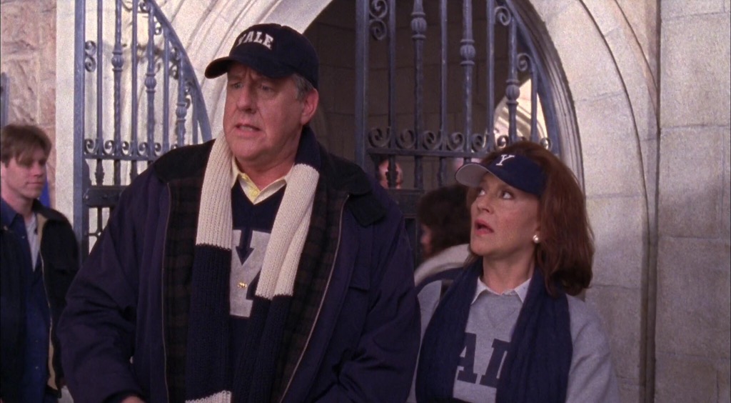 Julie: I loved the college switch-a-roo. I don’t know if that had been the writers’ plan all along, but I suspect it was. There would’ve been different drama if Rory had chosen to go to Harvard–being farther away from her mom, oh, and closer to her dad, who I think is still in Boston? But with her going to Yale, it sets up all this drama with the parents, which is marvelous. Of course Richard and Emily love that Rory is going to Yale, and it certainly has to burn Lorelai’s britches that her daughter is following in her grandfather’s footsteps. This whole situation makes her dad so happy, and that is never on Lorelai’s agenda.