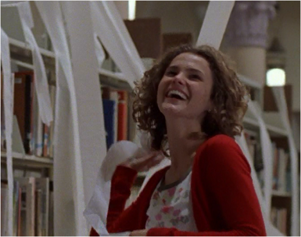 She realizes WAY too late (after she sees Meghan typing up a paper for their art history class), that she still hasn’t started her 25-page final paper. Whoops. Meghan, who’s interesting here because she’s actually doing her paper and working hard at it, suggests the opposite to Felicity — Go to the library and copy someone’s thesis.