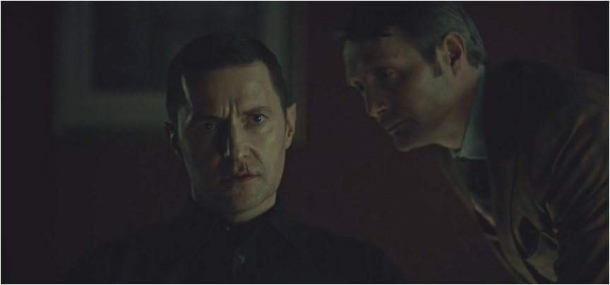 So while Will and Bedelia chat about Hannibal, Hannibal yucks it up with Jack about religion and their current predicament with the roles of God, the devil and the lamb getting dished out (Jack, Hannibal and Will respectfully).