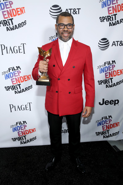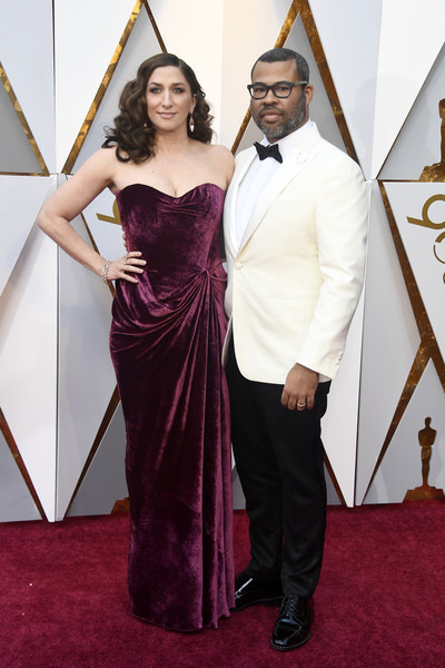 Winner of Best Original Screenplay Jordan Peele wore fire engine red to the Independent Spirit Awards on Saturday, but went with something more traditional at the Oscars in Calvin Klein. And Chelsea Peretti shows velvet isn’t just for tuxedo jackets.