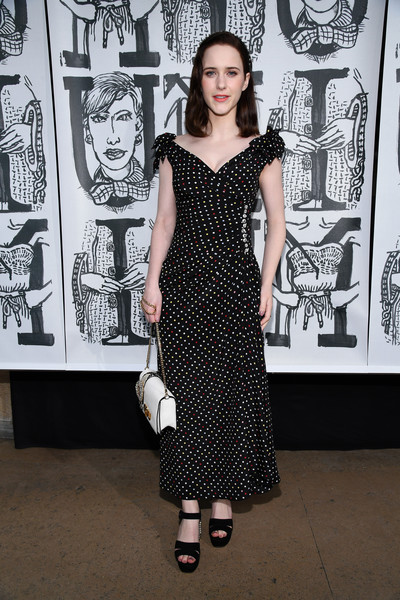 At the Miu Miu show, Mrs Maisel herself, Rachel Brosnahan goes for classic polka dots with a red twist.