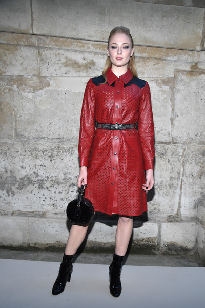 Lots of leather at Louis Vuitton including this belted shirt dress as worn by Sophie Turner. A fun switch up from the Sansa Stark fur of it all.