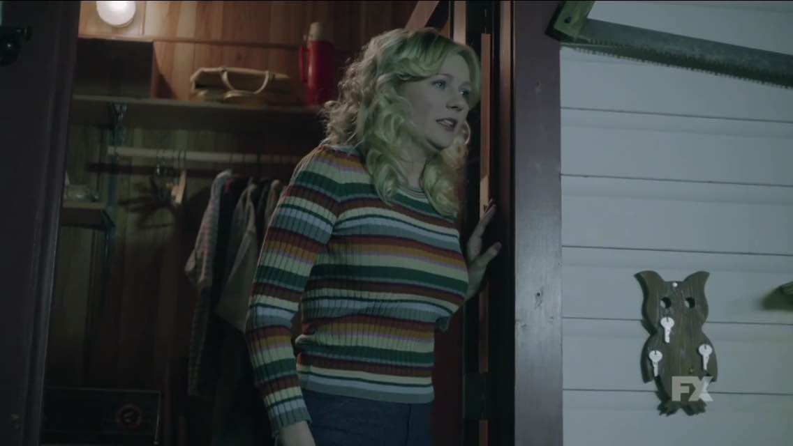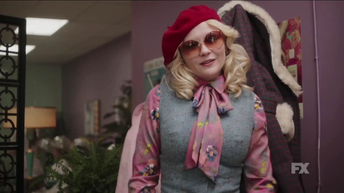 THE PEOPLE v. O.J. SIMPSON: AMERICAN CRIME STORY "Marcia, Marcia, Marcia" Episode 106 (Airs Tuesday, March 8, 10:00 pm/ep) -- Pictured: (l-r) Sarah Paulson a Marcia Clark, Sterling K. Brown as Christopher Darden. CR: Ray Mickshaw/FXThe mini-series category is stacked this year and I’m hoping that both Sarah Paulson and Sterling K. Brown will have their names called out on tomorrow. Paulson is pretty much a lock for her incredible portrayal of Marcia Clark and while Brown is more of an outside chance I will be disappointed if someone like John Travolta (because he is a movie star) gets nominated ahead of him. For the chemistry between Brown and Paulson alone they deserve an Emmy nod with late night office intimate dancing and a look in the hotel corridor that had me screaming KISS HIM; I did not expect American Crime Story to result in shipping of any kind. Fargo - Peggy in stripesKirsten Dunst