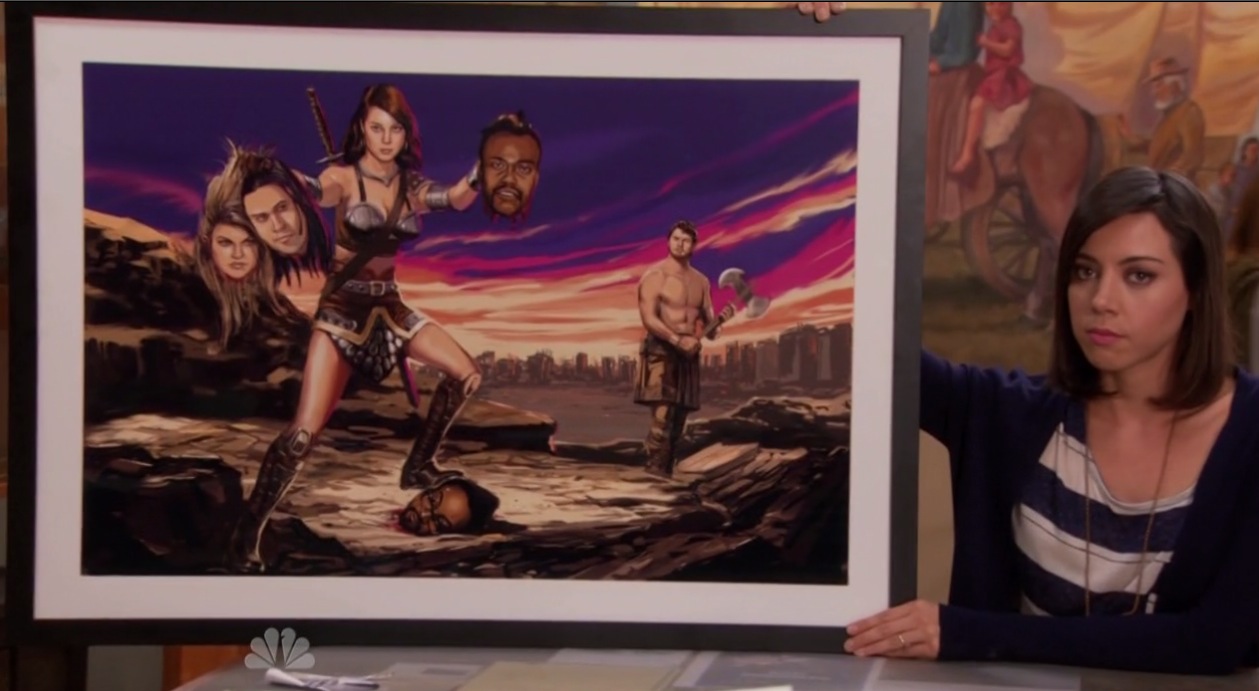 In the Parks office, although Leslie is suspended, she gives her friends some extremely thoughtful Christmas gifts. Highlights include Tom’s gift, a tiny throne and a watch with an insert that reads “Baller Time!” because he wasn’t able to go to the Watch The Throne tour, and an oil painting for April, of her victoriously decapitating all the members of the Black Eyed Peas in a Xena-like outfit. The gang think of a present to give to Leslie that will even the gift-giving scale, and come up with making a gingerbread and candy model of the Parks office. After some mishaps with accidentally ingesting poisoned silver M&Ms and a lot of marshmallow models of the Parks employees, the gang creates something that Leslie will most definitely love.