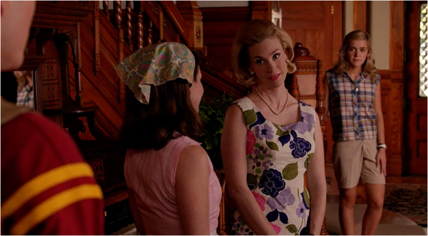 The tableau Don looks upon is the family he once had and he can’t go home as this family has moved on. So has Betty’s style as there is a softness here with frills and pattern.