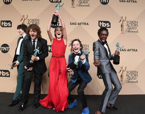 The Stranger Things older teens (actually in their ’20s) are super coordinated with Natalia Dyer standing out in astrology inspired Christian Dior couture. Is it me or is Dacre Montgomery pulling off the pencil ‘tache? He looks like a dandy in Giorgio Armani and he managed to do up almost all his buttons. Joe Keery keeps it classic in Saint Laurent.