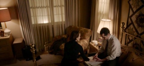 Schlamme previously directed one of the most intimate Philip and Elizabeth scenes, thankfully this time there is no tooth pulling. Here the only thing getting removed (on camera) is Elizabeth’s earrings. The camera moves from a static shot to overhead as they lean into each other, then lying down on the bed. The calculator beeps causing Elizabeth to laugh, it is good moment.