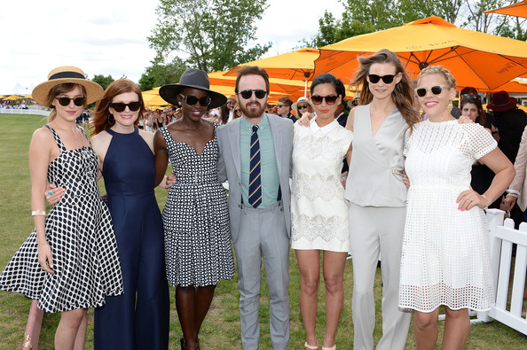Aaron PaulLast weekend a whole host of stars attended the Veuve Clicquot Polo Classic and this means it’s time for sunglasses and super cute dresses. Olivia Munn is radiant in white lace Lover (not pictured, but Munn also had the most amazing Devi Kroell wooden clutch), as is Busy Philipps. Both Lupita Nyong’o and Dakota Johnson work brimmed hats with black/white patterned frocks and Julianne Moore does the almost impossible and makes a jumpsuit appealing (by Rosie Assoulin, who also designed this Keri Russell dress). Only model Behati Prinsloo underwhelms in beige. Aaron Paul holds court in the center looking very dapper in a summer suit.