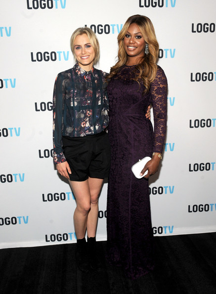 Laverne Cox and Taylor SchillingMTV and Logo are both premiering Laverne Cox Presents: The T Word documentary tonight and last night Cox was joined by her OITNB co-star Taylor Schilling to celebrate this television event. Cox spent the day wearing a variety of purple outfits for Spirit Day (and you can see them all on her Instagram) and she saved the best for last in this beautiful Monique Lhuillier lace gown. Schilling’s multicolored floral button down has a splash of purple and I wish we could see her shoes (or booties if I had to guess) a little better as it looks like the carpet has merged with her feet. There’s a clash in fancy levels between the two outfits, but as Cox is the one in the spotlight it makes sense that her attire is far dressier.