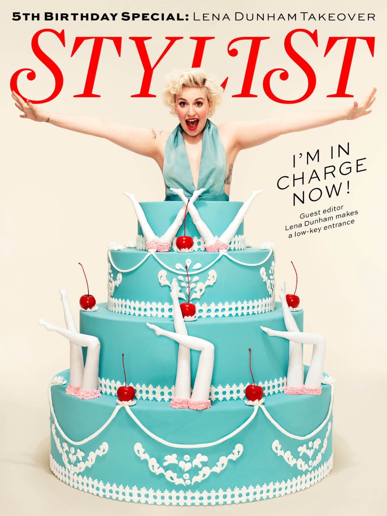 IMG_1022From one showrunner to another and Lena Dunham is still on her book tour for Not That Kind of Girl, plus this week she has guest edited Stylist magazine. Stylist is celebrating its fifth anniversary so what better way to combine the two than Dunham leaping out of a tiered cake. The cover shot by photographer Autumn De Wilde is also a nod to Dunham’s mother Laurie Simmons as legs are a repeated image in her work. It’s a fun, playful cover and the color palette really helps the image stand out.