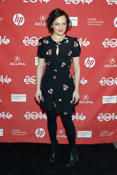 Sparkly jumper dress, black tights and boots for Elisabeth Moss at the premiere for The Free World is the glitzy form of red carpet attire here; count me all in.