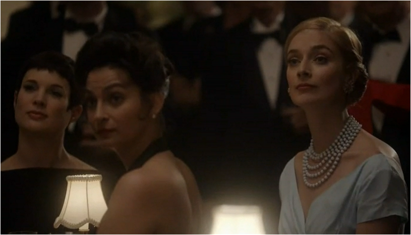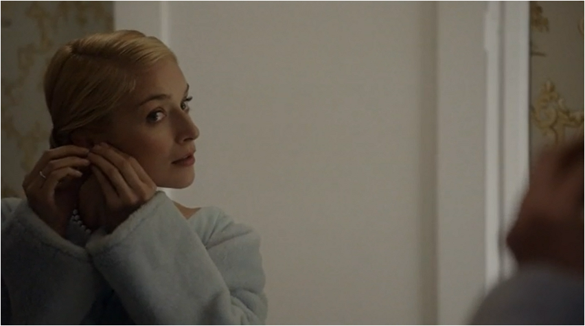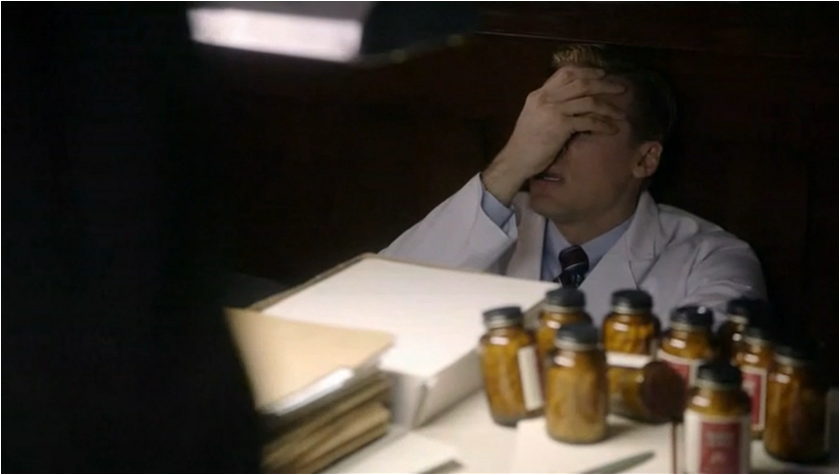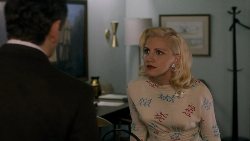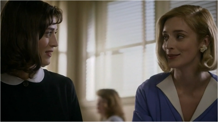 Lillian reacts to this in an extreme way and showing just how deeply this has cut her; she gives away her research that she worked so hard on to the man she named the test after and she won’t even get her own name on the study. For Virginia getting credit for the work she has done is important and part of this is because she has earned it, the other reason is so people can see that she is more than just a ‘mistress.’ When Lillian and Virginia present the work they are dressed alike, down to the high collar and similar shades of blue. The glaring difference is that one of them is in a white coat and the more subtle visual cue is that Virginia’s blouse is prettier and more feminine with bow and pleat detail. Lillian is all about unfussy clothing so that her gender doesn’t come into play in a field dominated by men. In Virginia’s dream she is wearing a white coat, plus her hair is pulled back a la Lillian and yet there is still this nagging voice that calls her mistress.