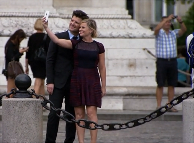 Happy 100th episode to Parks and Recreation and while they were over in London shooting the season 6 premiere they hopped across the Channel to Paris to film scenes for this milestone episode. Ben and Leslie are doing the whole tourist thing so a selfie in front of the Arc de Triomphe is forgivable (who am I kidding my Instagram is full of these kinds of shots, sadly not in Paris). Leslie’s mesh patchwork dress from M Missoni uses pattern and color to create an interesting visual; if she wore this in Pawnee it might look out of place, for Paris it is perfect.