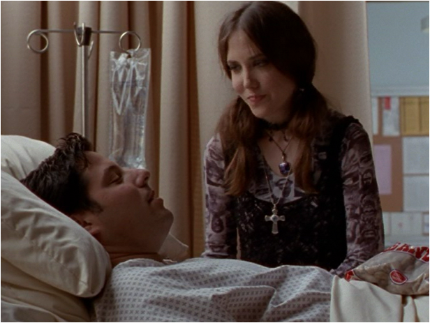 Bad dad John Ritter is back and he wants to make sure Ben’s okay. He comes to Felicity for help because obviously Felicity is responsible for repairing all of her friends’ relationships with their parents. John Ritter wants Ben to go to Al-Anon for help. Felicity thinks he sounds sincere, so she broaches the subject with Ben. He balks. Mr. Covington returns to Felicity’s apartment and, in a moment of despair, he nuzzles her neck and leans in to kiss her. She is, obviously, freaked and rightly so.